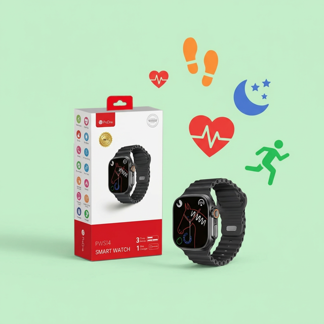 ساعت هوشمند ProOne PWS14 مشکی با طراحی شیک و مدرن، مجهز به صفحه نمایش لمسی، قابلیت پیگیری سلامت و فعالیتهای روزانه، اعلانهای هوشمند و عمر باتری طولانی، همراهی ایدهآل برای زندگی هوشمند و فعال شما.